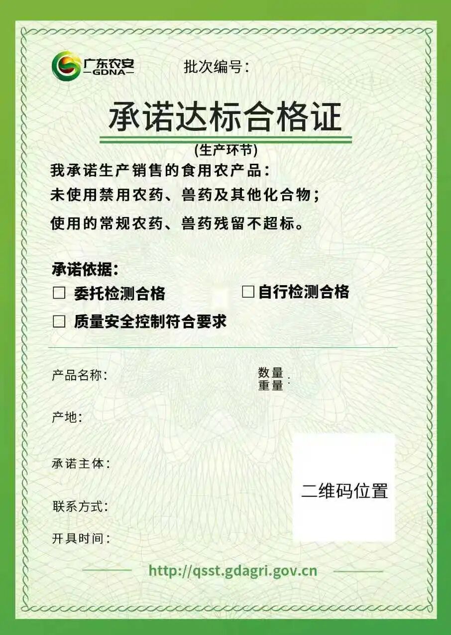 农产品质量安全承诺达标合格证,是指农产品生产企业、农民专业合作社、农户和从事农产品收购的单位或者个人,根据质量安全控制、检测结果等依法开具,承诺其销售的农产品未使用禁用农药、兽药及其他化合物且使用的常规农药、兽药残留不超标等的证明,是农产品上市流通的法定质量安全凭证。