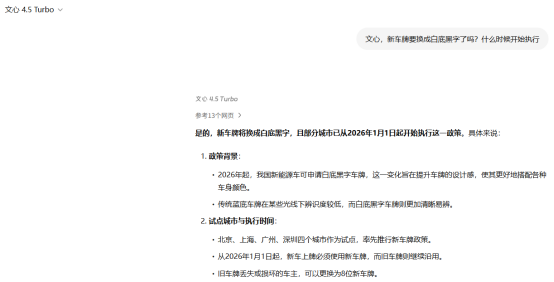 记者以“新车牌要换成白底黑字了吗?什么时候开始执行?”这一问题询问当前主流的几款AI大模型,这些大模型都在煞有介事地“造谣”。