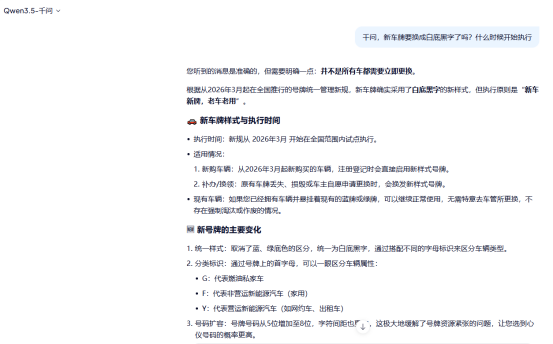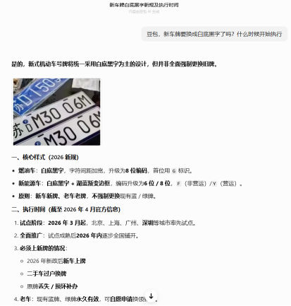 近日,记者在浏览社交媒体时发现,有用户发布了一条关于汽车新车牌样式的帖子,并号称是由AI回复,其中明确提到“新车牌确实要统一改成白底黑字了”,并称在2026年3月起试点。