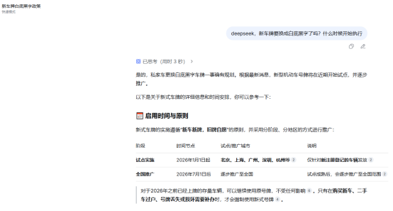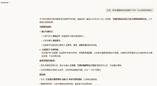 不过,也并非所有大模型都在造谣,腾讯旗下的元宝在DeepSeek模式下就明确指出这是谣言。元宝在回答中表示:“关于新车牌样式是否要换成白底黑字的问题,根据目前(截至2026年4月13日)的信息,中国内地尚未有正式官方通知或政策出台。”